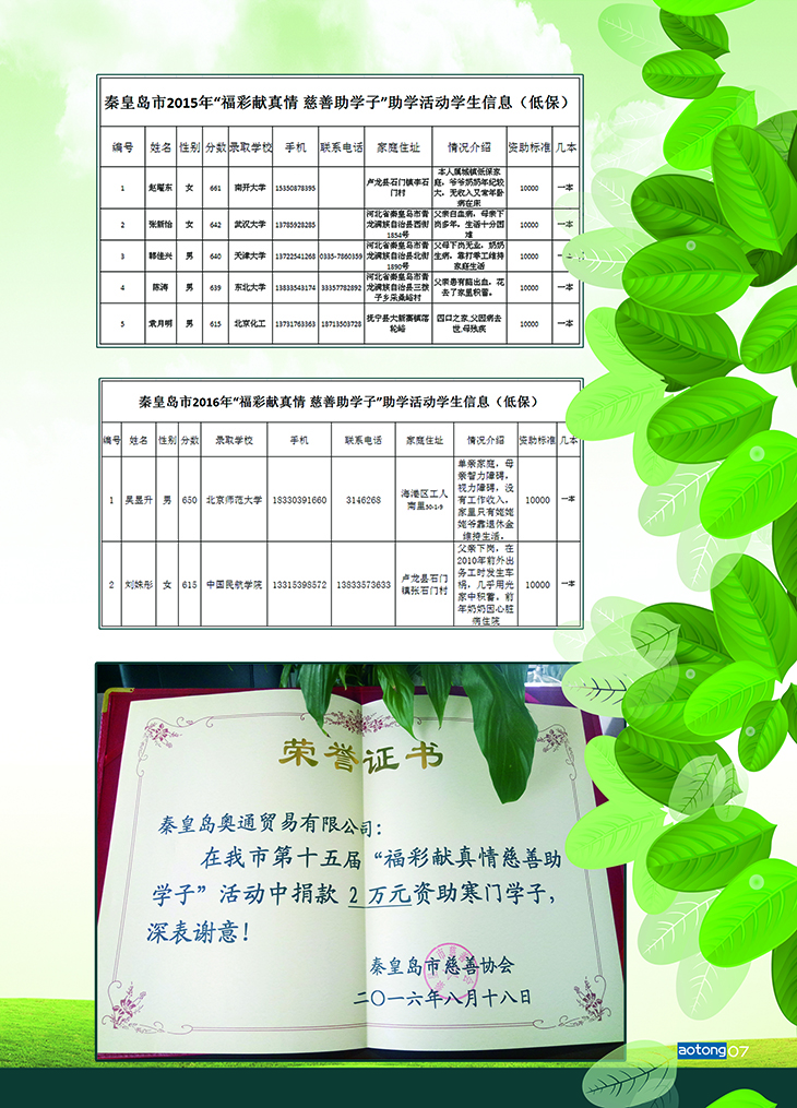 我市“福彩獻真情 慈善助學(xué)子”活動從2002年至今,已累計投入資助金3200萬元,資助人數(shù)6600多人,曾多次榮獲中華慈善總會、省慈善總會兩級慈善項目獎,已成為我市最具影響力的一個公益品牌,為秦皇島這座“中國最具愛心城市”提供了生動的注腳。