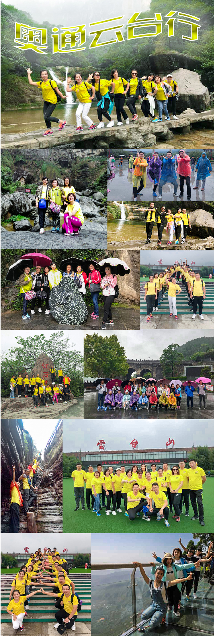 河南被稱為中華民族與華夏文明的發(fā)源地,河南地處中原,洛陽、開封又是中國歷史上諸多王朝的都城所在地。這里歷史古跡眾多,文化淵源深厚。在這個秋天奧通公司特組織員工到這文化深厚自然景色宜人的地方游覽,豐富員工文化生活、緩解員工工作壓力及加強公司團隊凝聚力,主要游覽了云臺山、龍門石窟、少林寺,雖走馬觀花,卻令人驚詫、感嘆不已。第一站我們游覽的是嵩山少林寺,少林文化是中國傳統(tǒng)文化的重要組成部分,到這里,當(dāng)然要游覽少林寺、看塔林、欣賞武術(shù)表演,但更令人印象深刻的是少林文化的強大氣場,這里教學(xué)、住宿樓房林立、配套商業(yè)、服務(wù)設(shè)施齊全,少林文化就是從這里傳播到了全世界。這一天小雨輕飛,吃過午飯我們又驅(qū)車前往龍門石窟。在雨中的龍門石窟,是那樣古樸典雅,在堅硬的石壁上鑿出石窟、雕刻出如此精美的各類佛教人物塑像、其精湛的技藝、虔誠的信仰、實在令人嘆為觀止。第二天依舊煙雨蒙蒙,我們懷著激動的心情來到了云臺山,,步入紅石峽、小寨溝景區(qū),震人心魄的景色映入眼簾。碧水青山紅石蜿蜒,雨后泥土的馨香,加上好似云霧從天而降的瀑布,人間仙境一般。短暫的行程,雖有些許疲憊,但卻收獲了無限美景和快樂,而這段時間,最開心的是大家不慌不忙說說笑笑一起拍照,感覺好輕松好隨性,奧通這個大家庭,愛的味道在我們之間彌漫,我們將文化里人文風(fēng)情中的親情愈演愈烈,感謝時光,感謝奧通這個平臺,把我和你變成了我們。不管是在工作中還是在游山玩水中我們互幫互助,一起前進。這一路上我們有收獲,有幸福,相信這會是時間都偷不走的最美好的片段!
